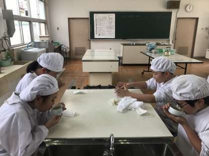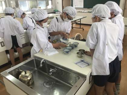 ガスコンロでお湯を沸かし、急須にお茶の葉を入れて、茶碗にお茶を入れていきます。4人に同じ濃さのお茶が入るよう、入れ方の順番を事前に学習してからの実習でした。