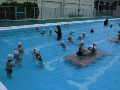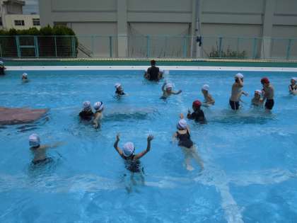 途中で、プールの真ん中に「中の島」を入れて、そこまで、「カニ」「ウサギ」「ワニ」になって歩いていきました。