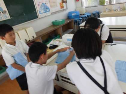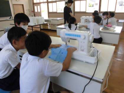 5年生は、林間学習に自作のナップサックを持っていくために、家庭科の学習をがんばっています。