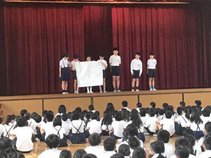 高学年になるほど、自分に厳しい結果は出ていました。でも、生活指導部長の矢田先生から、児童集会での集合の様子や、話の聞き方が非常に良くなった、と褒めてもらいました。これは、高学年が中心となって、児童会をひっぱってくれているからですね。