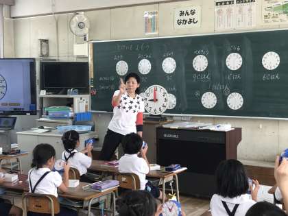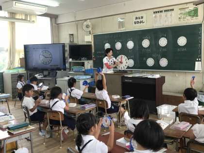 「ちょうど〇時」と「〇時半」の読み方を学んでいます。時計の教具やデジタル教科書などを利用して、できるだけわかりやすく学べるようにしています。マスターするためには、生活の中で使うことが大事です。さりげなく、でも意識して、時計の読み方に慣れ親しめるように、声掛けをしてあげてください。