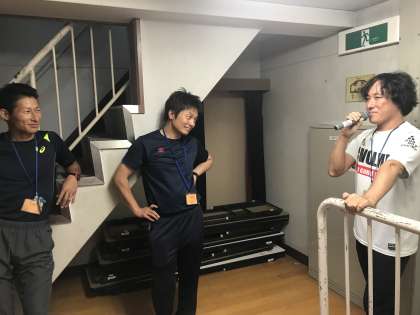 声の答えは「高倉先生」「樫山先生」「久野先生」「河野」「大原先生」「笠井先生」です。も「ドラえもん」の物まねは、高倉先生。子ども達は、ザワザワ…(笑)講堂内を見渡し、いない先生から考えています。久野先生は英語であいさつ、河野は、野太い声で「A・RA・SHI」を歌いました。子ども達は、どの声も「大原先生や」と(笑)