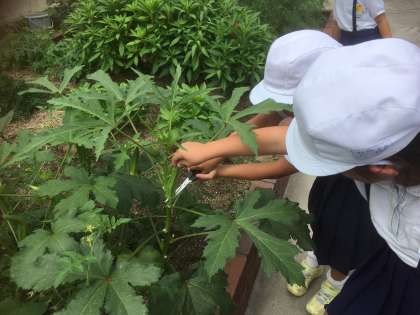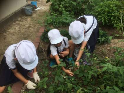 子どもたちは、ミニトマト、オクラ、枝豆を夢中になって収穫していました。