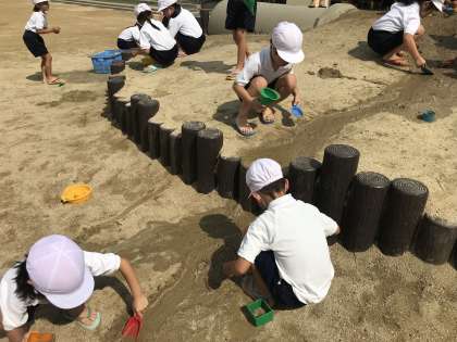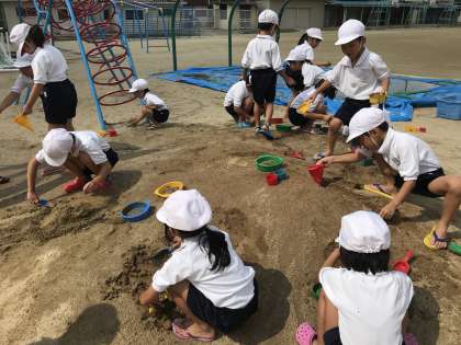 砂山に水を流し、川を作って「大和川や(^O^)」。どろだんごを作ったり、容器にどろを入れて、ひっくり返してプリンやケーキに見立てたり、大いに楽しんでいました。