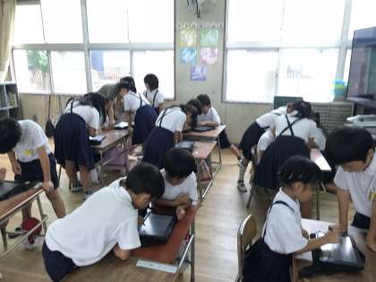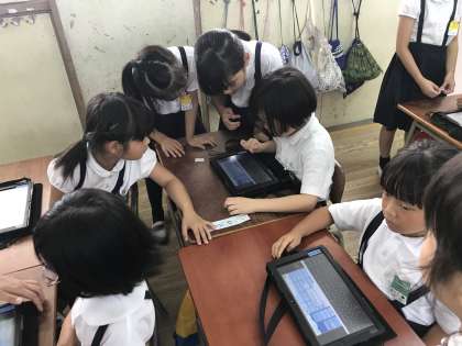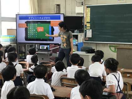 タブレットの使い方を、2年生がミニ先生になって「ログインのしかた」「シャットダウンのしかた」「お絵描きアプリの使い方」を教えてくれました(^O^)