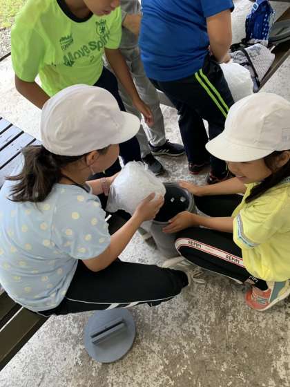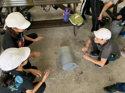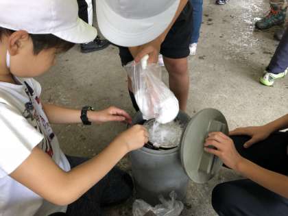 缶にオレンジジュースをいれます。そして、氷と塩を詰めたドラムに入れて15分間のコロコロタイム。詰め込むための氷がなかなか割れずに大苦戦したようです(;^_^A