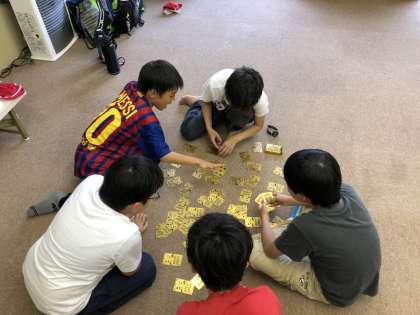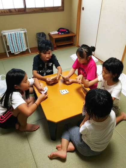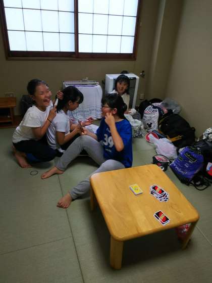 お風呂あがって、部屋でカードゲームをしているのはいいのですが、暴れていて"(-""-)" 女子からクレームがきているようです(笑) 困ったものです。さあ、カミナリが落ちますね(^O^)