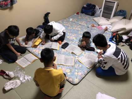 女子はちゃんと机の上で書いているのに、男子!お布団の上で、寝転んで書くとは、こらこら…(笑)
