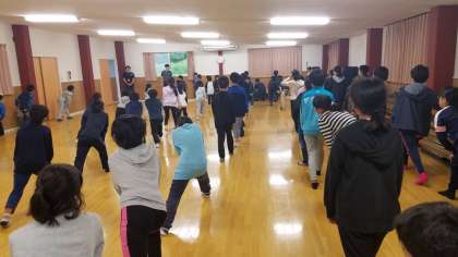 現地の天気は、雨。朝の集いは、多目的ホールで実施しました。