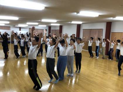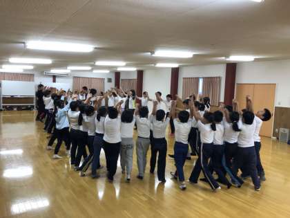 勾玉作りに焼き板作り。腕の力は使っても、全身運動ではないので、昼ごはんに向けて、お腹を減らし、手作りカレーがより一層おいしくなるために、多目的ホールで、Let's dance!(^O^)
