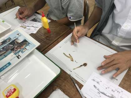 「魚とヒトの同じところとちがうところはどこだろうか」という6年生の単元の学習内容です。カタクチイワシ(煮干し)を解剖していきます。背骨の部分から竹串を使って解剖をすすめ、目・水晶体・脳・えら・心臓・肝臓・胃・卵巣(精巣)などに分けていきます。脳の部分につながっている「耳石」を見つけられたら、ラッキーということで、みんな意欲的に取り組みました。