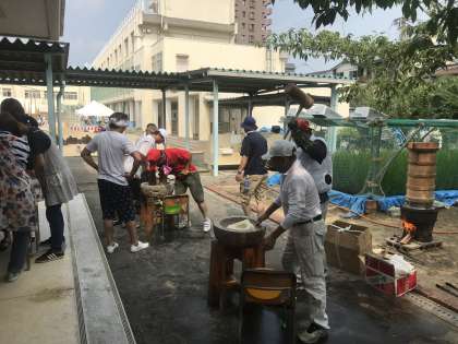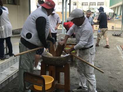 講堂前では、校友会の皆さまによる、みんな大好きな「おもち」の準備。