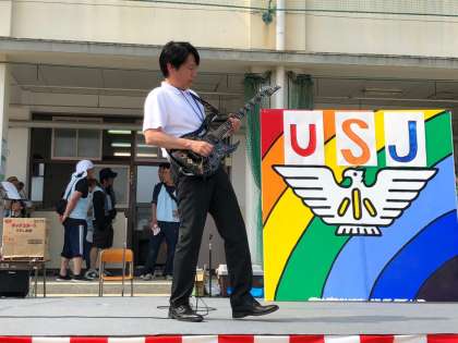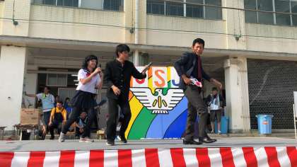 一昨年、津村先生が子どもたちと一緒に「恋ダンス」で登場し、昨年度にコント「三太郎」ダンス「USA」で教職員も出場するようになったのですが。