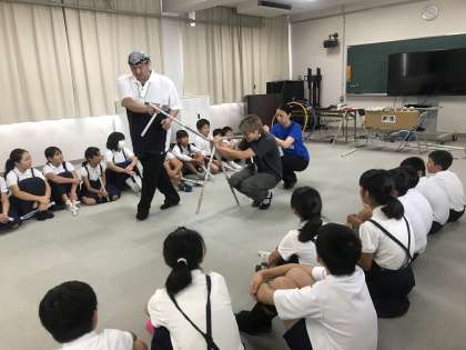 事前に新聞紙を丸めて棒を2種類作成しました(始業式)
