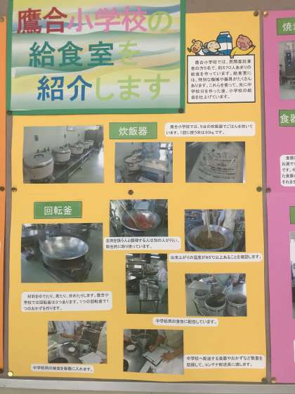 鷹合小学校の給食室の紹介がされています。中野中学校との親子給食も始まった2学期。民間委託業者の方、5人で約570人余りの給食を作っています。