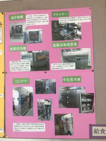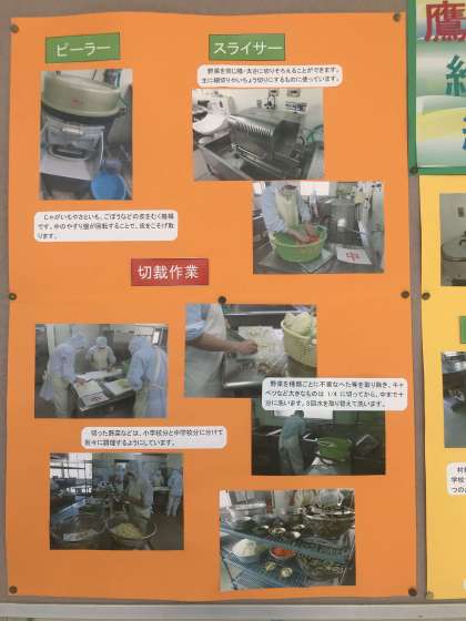 給食室には特別な器具や機械があくさんあります。それらを使って、先に中野中学校の分を作り、その後に鷹合小学校の分を仕上げているそうです。