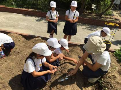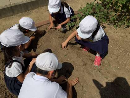 3時間目、学習園で田辺大根の種をまきました。去年の2年生が育てた大根からとれた種です。一人3つずつ畑にまきました。2〜3日すると、芽が出るようで、子ども達は楽しみにしています。