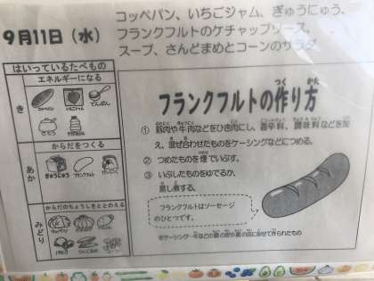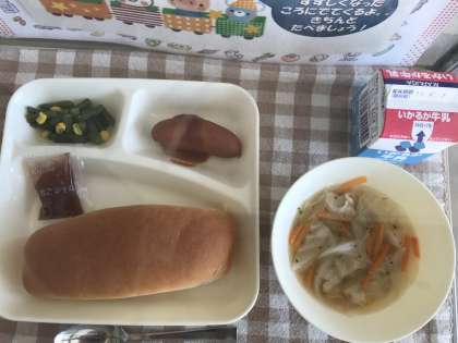 フランクフルトが子どもたちには大人気です。欠席者の分などのおかわり争奪じゃんけんが繰り広げられているところに遭遇(6−1)。スープやサラダも増やし、両手がふさがっていた男の子はパンのおかわりじゃんけんにも参加したくて、口じゃんけんしていました(笑)