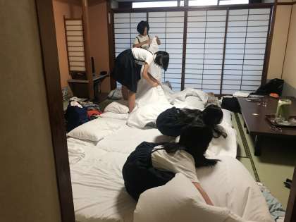 目覚め、寝ぼけまなこで布団を上げて、朝の集いへと急ぎました
