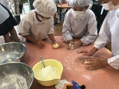 次は、バターを練りこんでいきます。みんな、粘土遊び?を思い出して、一生懸命。