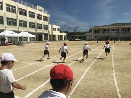 1年生は、「まっすぐ走る」ことが、めあてです。ラインは引いてあっても、ゴールが近づくと、走った後の待機場所に向かって走ってしまいます。