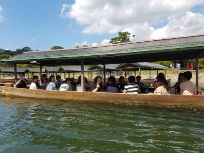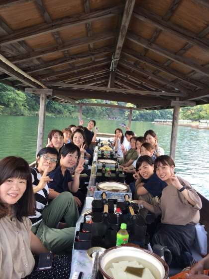 バスで京都方面へ向かい、まず北野天満宮を参拝し、嵐山で屋形船に乗船し、美味しい昼食をいただきました。