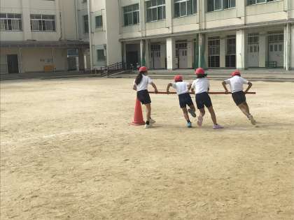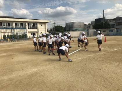 コーンの周りをまわるときに、台風の中心になる人と、棒の外側になる人で動きを工夫することが速く回れるコツです。また、陣地に戻ってきてから、順番に棒を飛び越し、その後、すぐにしゃがみ込むチームワークも大事です。