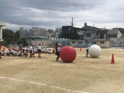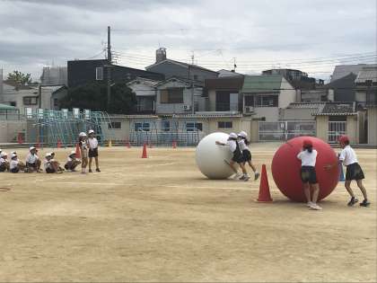 2年生の団体競技は「力を合わせて、大玉ころころ」です。自分たちよりも大きい玉を、二人ペアになって転がしていきます。けっこう難しく、コーンの周りを回すのは、二人で協力しないとだめです。