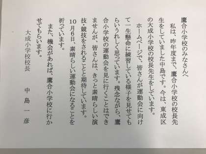 現大成小学校校長でいらっしゃる中島校長より、運動会に向けてお手紙をいただきました。