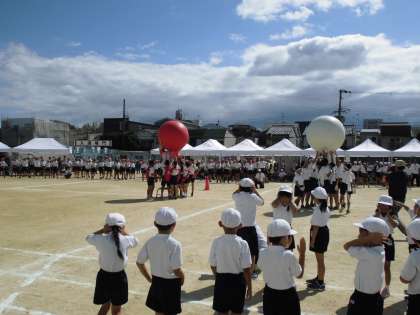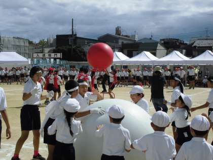 全校競技は「とどけ!われらの思い 〜大玉送り〜」です。校長先生と教頭先生へ大玉を送ります。最後は、大玉を頭上で持たないとけないのですが、これが、なかなか難しい。応援団と共に支えて「セーフ!」という感じです(^O^)