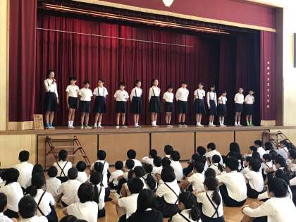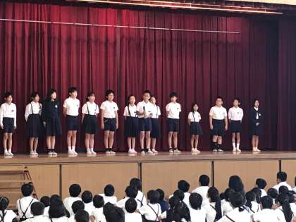 今日の児童集会は、前期学級代表から後期学級代表への引き継ぎでした。