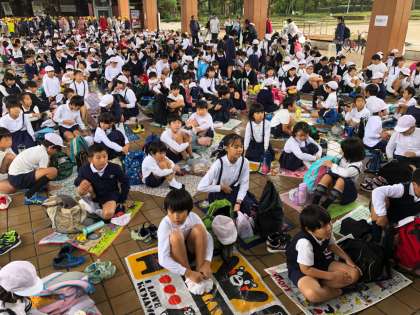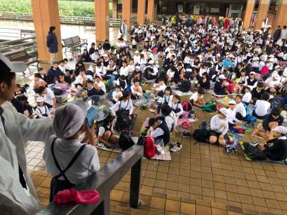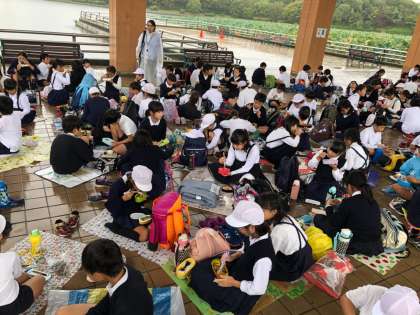 できたら、大芝生広場でのびのびと食べたかったのですが、今日は芝生広場もグチョグチョだったと思います。屋根の下で、いただきました。大泉緑地の方が、休憩所内のトイレを開いてくださったので、助かりました。この時も、6年生が低学年に付き添って連れて行ってくれました(^O^)