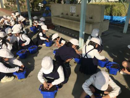 学習園で肥料も入れた土を作り、一人ずつ植木鉢に入れてもらいました。