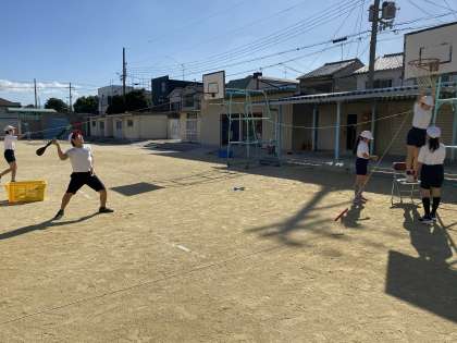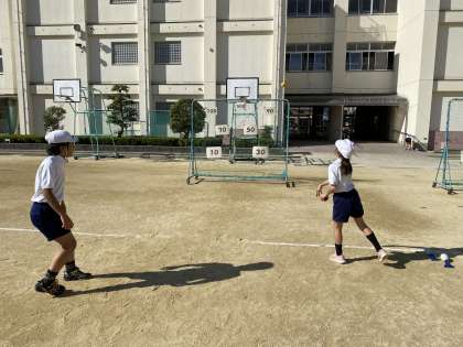 児童の体力・運動能力の中で、本校児童が全国平均や大阪市平均よりも低い結果がでているものに「ソフトボール投げ」があります。