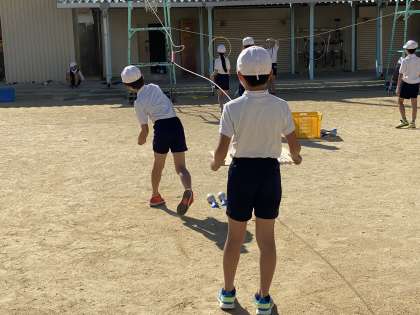 春と比べて「投げる能力」を伸ばすために、いろいろな創意工夫された「場」が用意されています。体育の時間を中心にですが、ボール投げが不得意な子ども達も、意欲的に取り組める、投げるフォームが自然に身に着くことができるような「場」となっています。