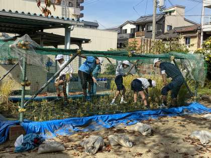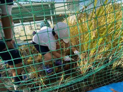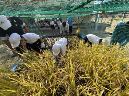 本日の2,3時間目は「鷹合田」の稲刈りです。JA大阪市の方に来ていただいて、稲刈りについて教わりました。