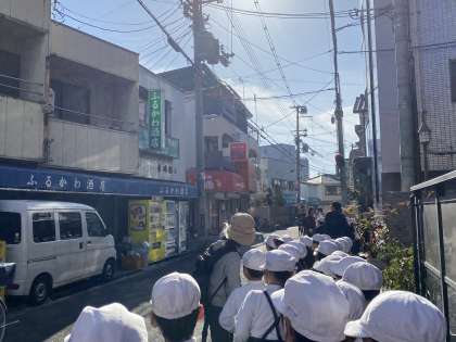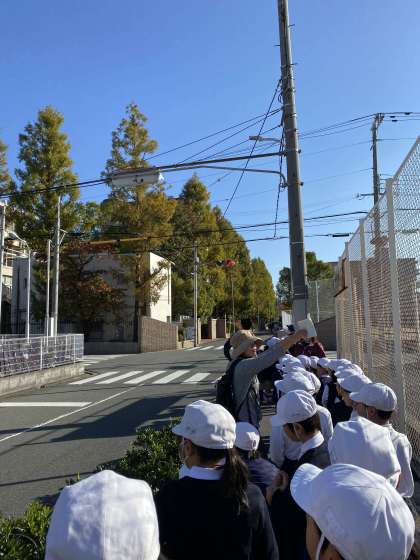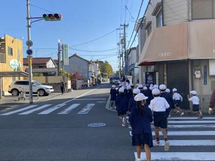 歩道があっても駐車場からの車の出入りが予想される場所では、気をつけることを伝えました。また、「左に万代、前は木がいっぱいの大学、その横を右へ!」とか「ふるかわ酒店、中国料理!のお店のところ…」というように、事前学習で子ども達が覚えやすいように教えたことを確認しながら進みました。