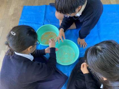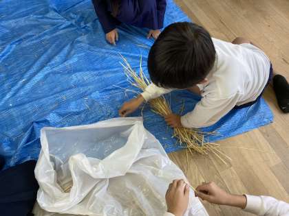 鷹合田で収穫した「鷹合米」。脱穀⇒もみすり⇒精米の過程を経ないと食べられません。収穫したほとんどのお米は、JA大阪の方々にお願いして精米までしていただきます。でも、実際の昔の人々の苦労を知るのも大きな学習です。クラスごとに稲束を置いておき、玄米までにする過程を体験します。