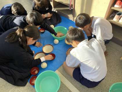 次は、「もみすり」です。すり鉢の中にもみを入れ、ソフトボールで「ゴリゴリ」とすりながら殻を外していくのがよくあるパターンです。河野も前任校や前々任校で、5年の総合の時間に取り組みました。「ゴリゴリ、フーッ!」と吹き付けたら殻を吹き飛ばせるのですが、目に入ると痛いです。
