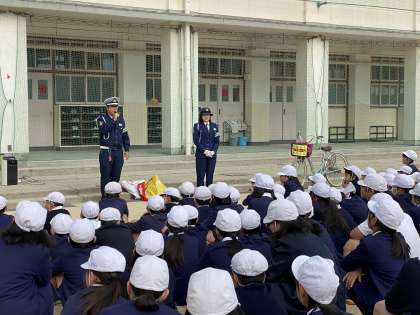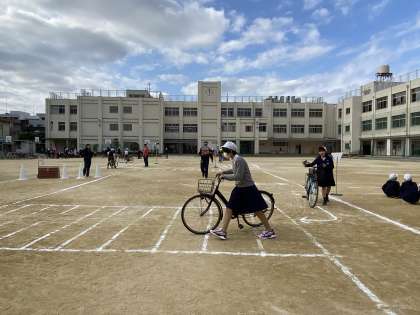 友達がもってきてくれた自転車を借りて、一人一人が模擬道路で安全な乗り方の指導を受けました。日暮れが早くなっているので、暗くなってから自転車に乗らねばならない場合は、明るい服やライト、反射材などで車の運転者に自分の存在を早く知らせるようにしましょう。