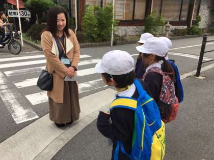 リーダーさんや時計係、電車係や副リーダー。役割分担もしっかり。途中の学習ボランティアのお母さんたちに会った時の、ポイント通過確認のやりかたも確認しました。