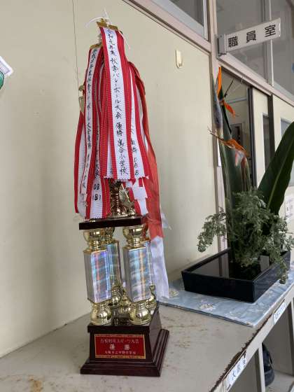 24日(日)に、PTA五校対抗スポーツ大会がありました。ママさんバレーは優勝されたそうです。おめでとうございます。トロフィーを職員室前に飾らせていただきます。