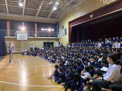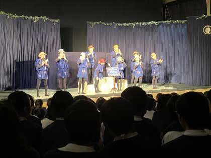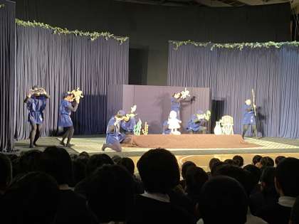 本日、劇団あとむに来てもらい、「あとむの時間はアンデルセン」という、アンデルセン童話からの二つのお話、歌もいっぱい、アニメイムもいっぱいの音楽劇を見せてもらいました。ふだんの舞台が座席になり、講堂が異空間の劇場に変身。妖精姿の役者さんが迎えてくれて、期待感が高まりました。