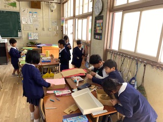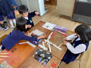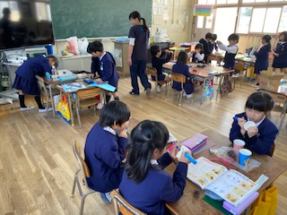 1年生たち。この間の学習発表会で見ていただいたとおり、とても成長しています。1学期には、たてわり班で助けてもらった「鷹合フェスティバル」 もう自分たちで、お店づくりもできるようになりました。