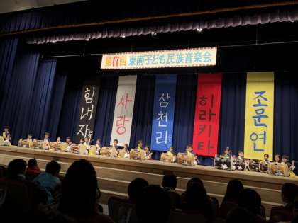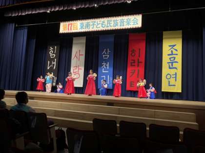韓国・朝鮮にルーツのある子どもたちがチャンゴ、ケンガリなどの楽器を使ってサムルノリ(演奏)をしたり、タルチュム(仮面の踊り)なども披露していました。どのグループも一生懸命に発表をして、素晴らしかったです。