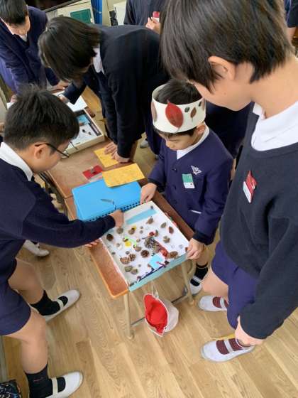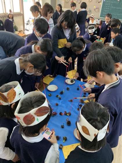 一年生が『秋みつけ』で拾い集めたドングリやマツボックリで「どんぐりランド」を開き、いつもお世話になっている六年生と二年生を招待しました。