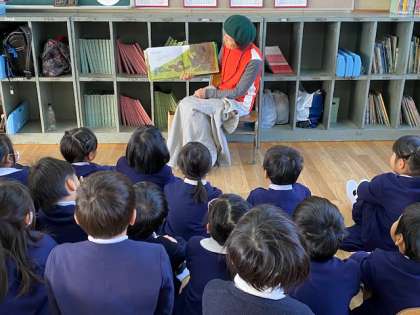 「お話玉手箱」の方が月に2回、1・2年生に読み聞かせに来てくださっています。