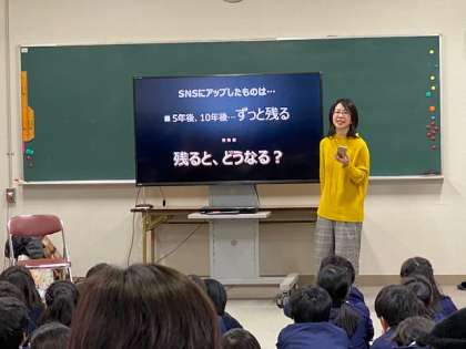 5年生は、サポートセンターの方々に出前授業をしていただき、親子で「スマホやSNSの危険」について学びました。