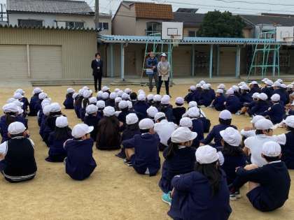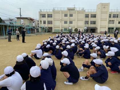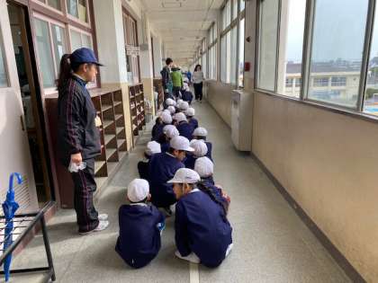 さて、南海地震がいつ起きてもおかしくないといわれています。津波も押し寄せてくることが想定されています。鷹合地区は上町台地にあるので大丈夫ということですが、休み時間に大地震が起き、身を守る行動をとったあとに、運動場に避難。そして、津波警報の発令により、校舎の安全が確かめられたという想定で3階に避難、という訓練を実施しました。