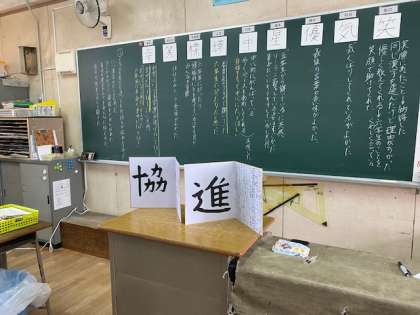 プレ授業で実施した1組は「進」、3組は「協」でした。色紙に清書、一人一人のメッセージを添えて、6年生にプレゼントするそうです。